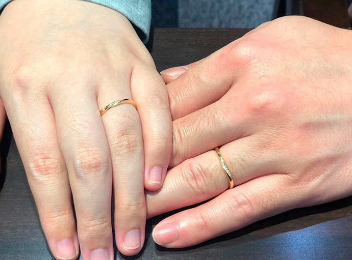 他と被らないイエローゴールドのお色味がおふたりらしいと気に入っていただきました😊